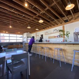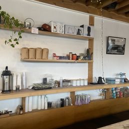 Wonderful open layout, roll up doors on each end of the shop with lots of seating. The coffee was outstanding! I asked the barista to give me something he thinks I should try that's sweet and hot.. Cinnamon honey latte was "chefs kiss" I love the low prices!!! The barista was a gem, the small bites were delicious, we got a ham and cheese croissant and a churro muffin. I do wish they had a few more items to choose from; A cookie, maybe some sort of muffins, scones? A little more variety. I would recommend a few more syrups like LAVENDAR-VANILLA(hint*hint*) Thank you! I'll be back for another Strawberry latte.